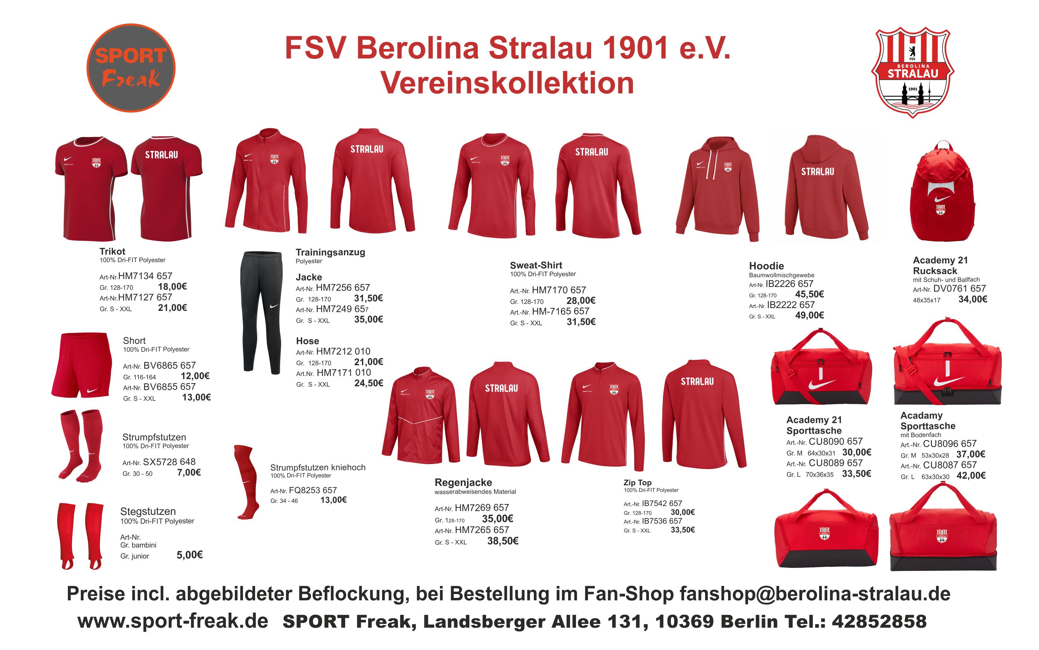 Um im Verein ein einheitliches Erscheinungsbild zu ermöglichen, bieten wir Ihnen neben Verträgen mit den Sportartikelfirmen zu guten Einkaufskonditionen auch Hilfe bei der Auswahl einer Vereinskollektion an. Dies hat den Vorteil, dass auch die Eltern umfassend über die Vereinsbekleidung informiert sind und ihre Sprösslinge mit dem entsprechenden Equipment ausstatten können. Wir empfehlen die Artikel vor der Bestellung in unserem Ladengeschäft anzuprobieren. Dafür stellen wir entsprechende Muster zur Verfügung. Bedruckte Artikel sind vom Umtausch ausgeschlossen!