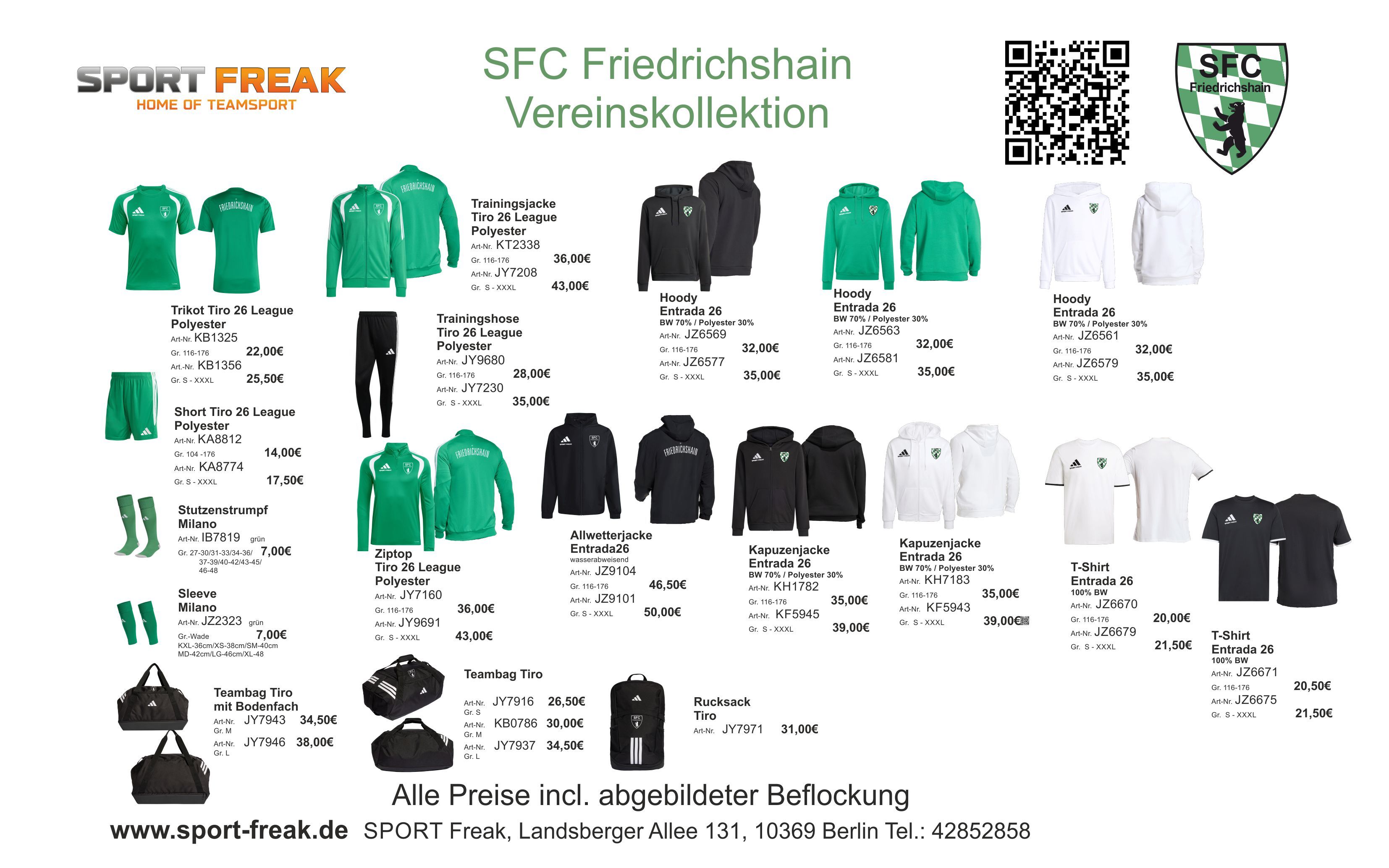 Um im Verein ein einheitliches Erscheinungsbild durchzusetzen, bieten wir Ihnen neben Verträgen mit den Sportartikelfirmen zu guten Einkaufskonditionen auch Hilfe bei der Auswahl einer Vereinskollektion an. Dies hat den Vorteil, dass auch die Eltern umfassend über die Vereinsbekleidung informiert sind und ihre Sprösslinge mit dem entsprechenden Equipment ausstatten können. Wir empfehlen die Artikel vor der Bestellung in unserem Ladengeschäft anzuprobieren. Dafür stellen wir entsprechende Muster zur Verfügung. Bedruckte Artikel sind vom Umtausch ausgeschlossen!